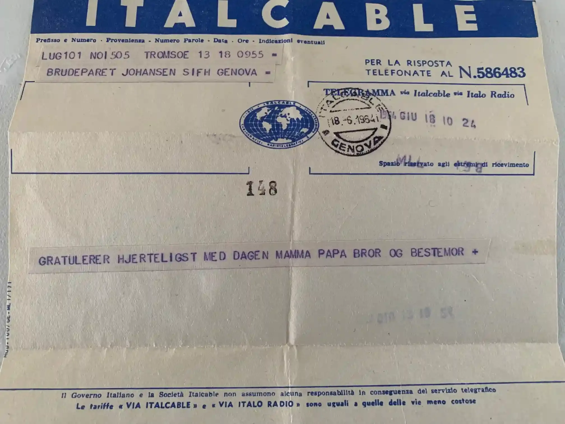 Mine foreldre var i Genova i 1963 og 1964, reiste ut derfra, var tilbake og til slutt ble de gift der, 19.juni 1964 - mens min mor var gravid med meg.