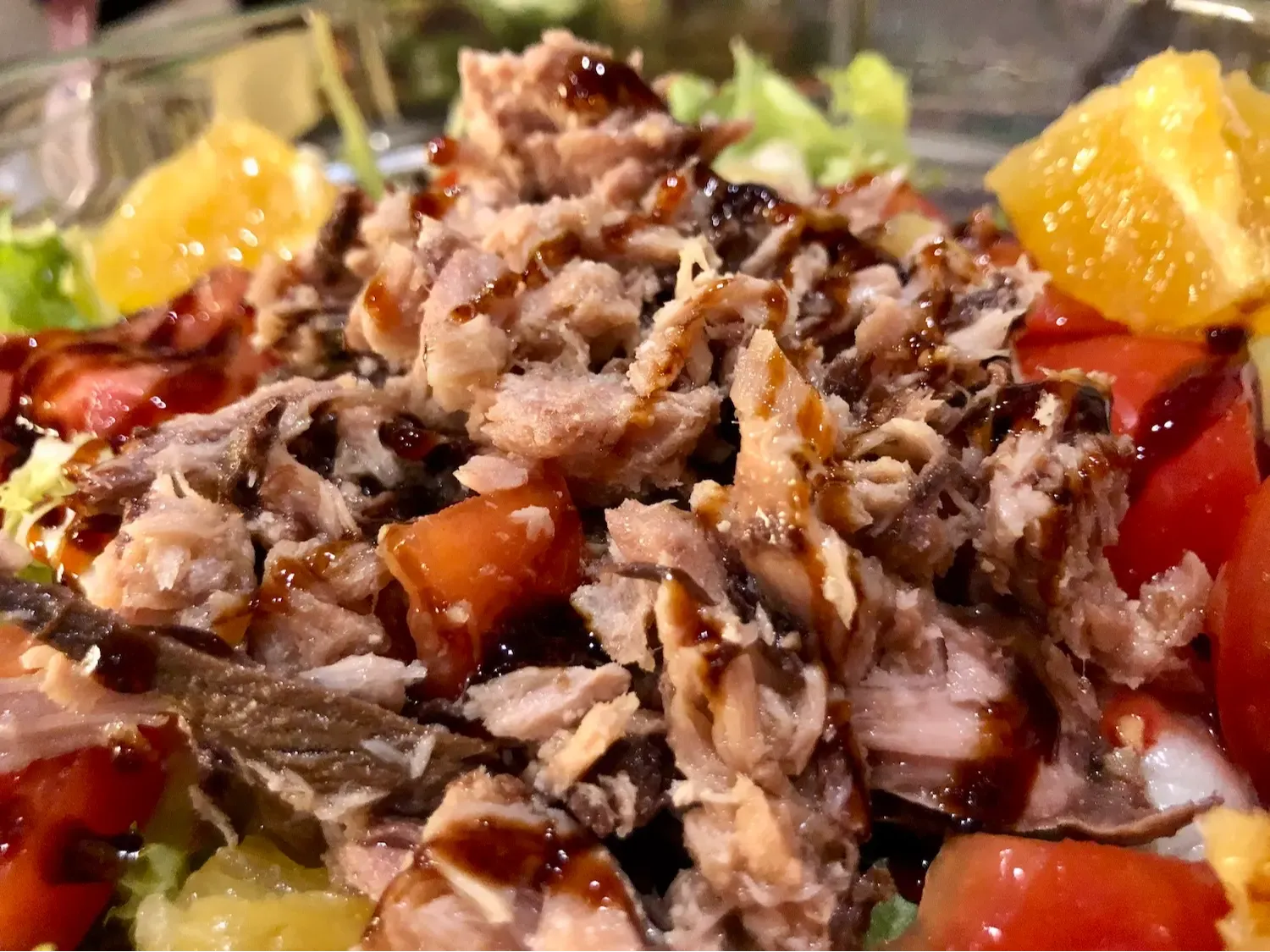Du ser kanskje at dette er tunfisk, og at det er appelsiner og mye annet godt. Denne retten fikk jeg servert på et sted i Siracusa.