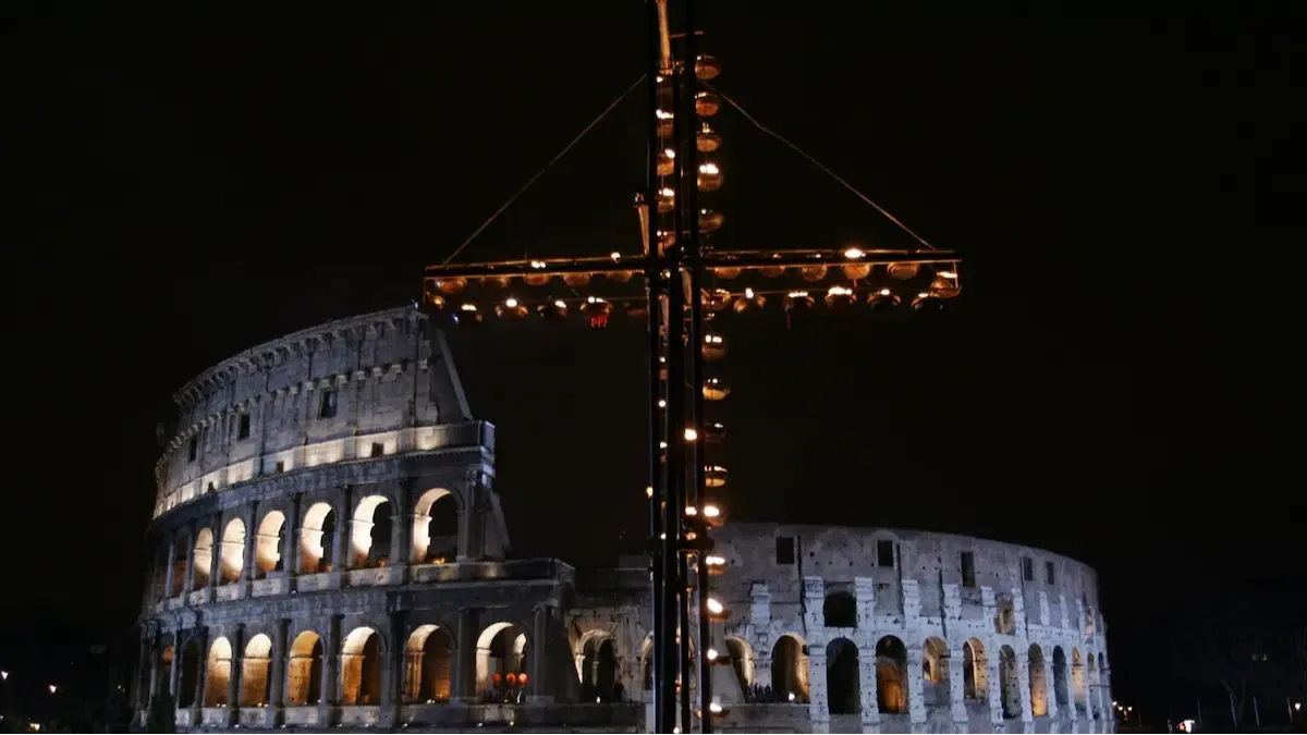Over: Bilde av kors utenfor Colosseum i Roma.
