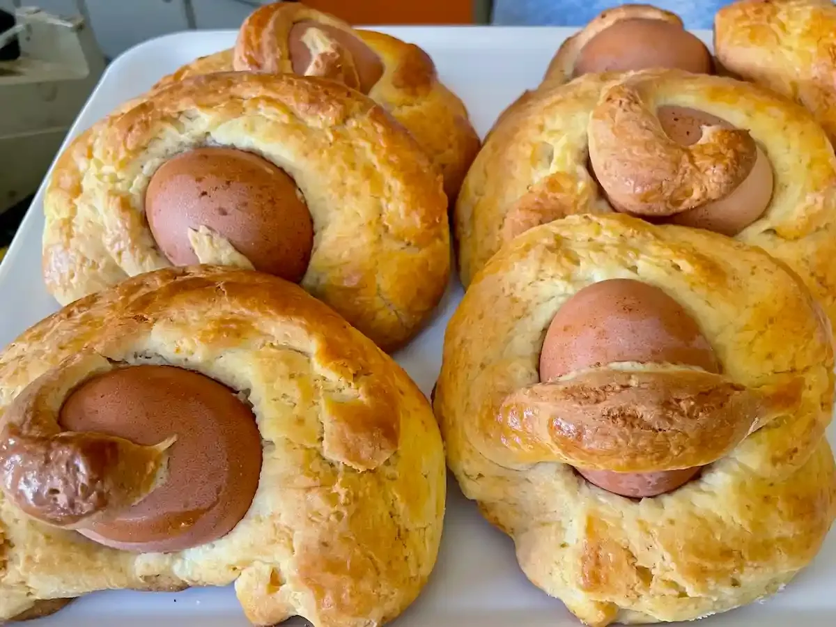 De bakes av en mørdeig, og har oddetalls antall kokte egg og symboliserer gjenfødelse.